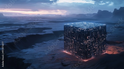 The watermark will not be included on Canvas Print.: 3d animation of a glowing cube on a desert landscape in the evening
