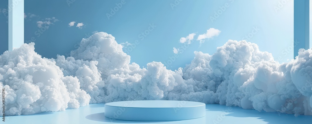 Canvas Prints 3d blue podium surrounded by fluffy clouds under a serene sky. free copy space for text.