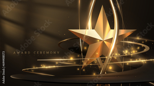 The watermark will not be included on Canvas Print.: 3d gold star with black ribbon elements and sunlight breaks through the back window with bokeh decor