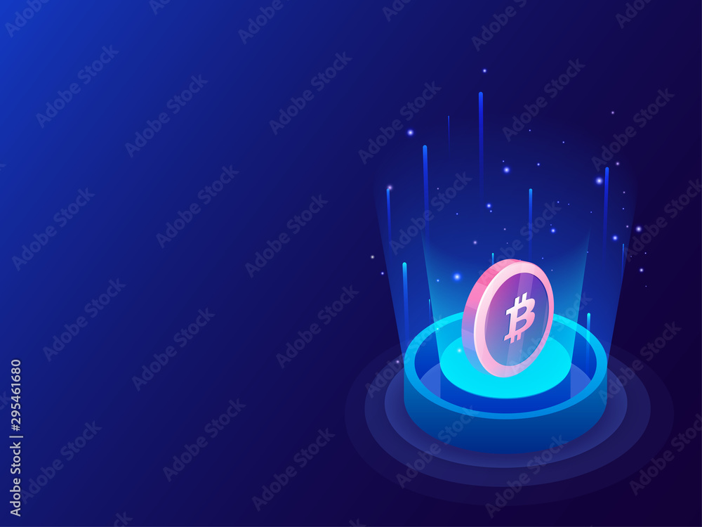 The watermark will not be included on Canvas Print.: 3d illustration of bitcoin between emerging digital rays on glossy blue background for crypto mining