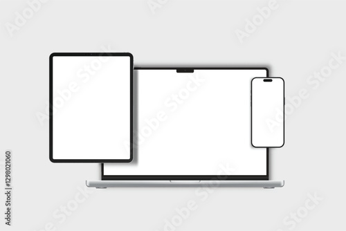 The watermark will not be included on Canvas Print.: 3d laptop, tablet and smartphone digital device mockup with blank screen isolated on background - tec