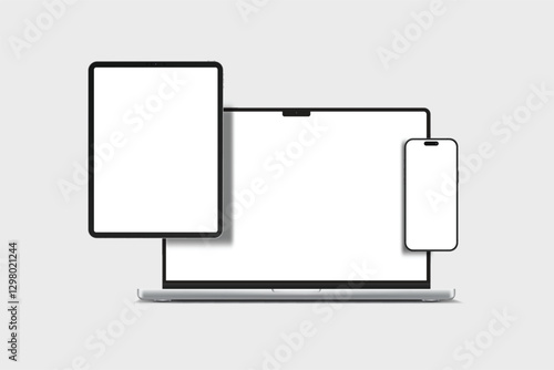 The watermark will not be included on Canvas Print.: 3d laptop, tablet and smartphone digital device mockup with blank screen isolated on background - tec
