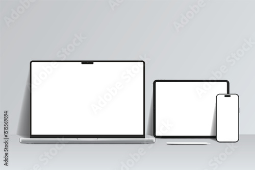 The watermark will not be included on Canvas Print.: 3d laptop, tablet and smartphone digital device mockup with blank screen isolated on background - tec