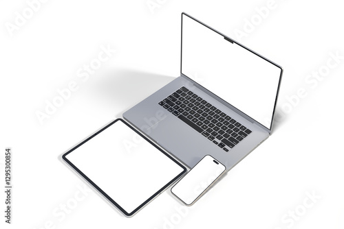 The watermark will not be included on Canvas Print.: 3d realistic laptop, tablet and smartphone digital device mockup with blank screen isolated on backg