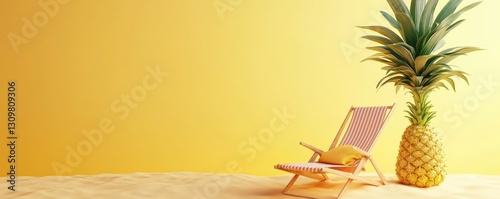 The watermark will not be included on Canvas Print.: 3d render, summer background with palm tree and beach chair in a pineapple shape on a yellow color b