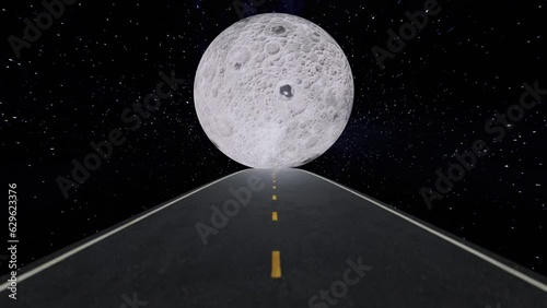 The watermark will not be included on Canvas Print.: 3d rendered animation of a road leading to the spinning moon on the starry background