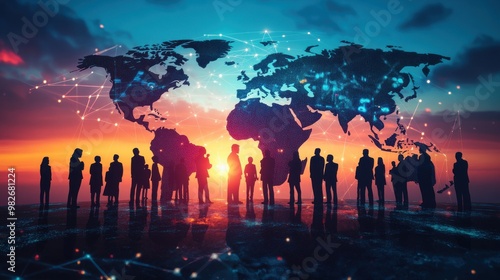 The watermark will not be included on Canvas Print.: 3d rendering of a world map with a global network and business people silhouettes connecting on a bl