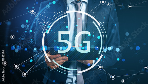 The watermark will not be included on Canvas Print.: 5g technology concept with businessman using tablet -
