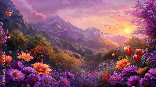 The watermark will not be included on Canvas Print.: A beautiful field of flowers with a red mushroom in the foreground
