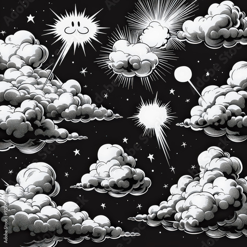 Canvas Prints a black and white drawing of a starry sky with clouds and a sun. the clouds are drawn in a way that