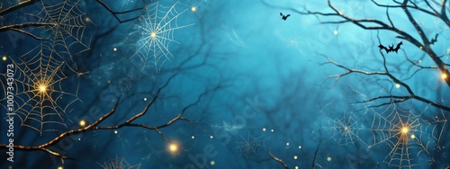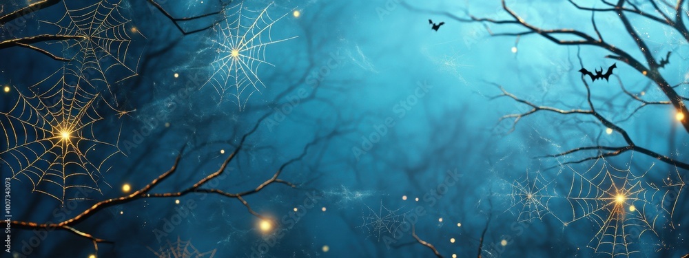 Canvas Prints a blue background with golden spider webs in the foreground, glowing lights and bats on tree branche