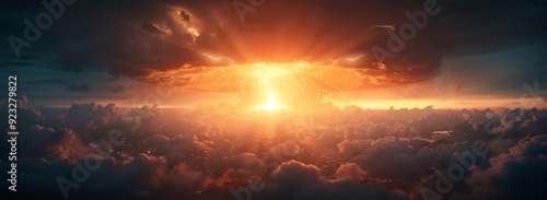 The watermark will not be included on Canvas Print.: A bright orange explosion in the sky with a city below by ai generated image