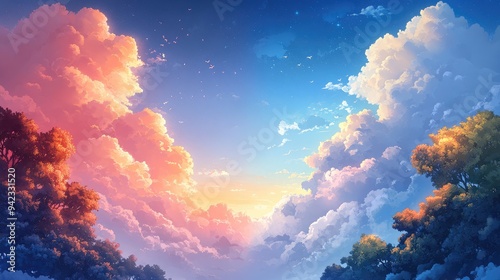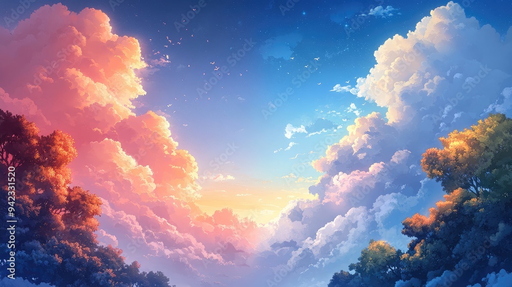 Canvas Print : A cartoon scene with colorful, soft-edged clouds floating above a magical landscape, adding a dreamy