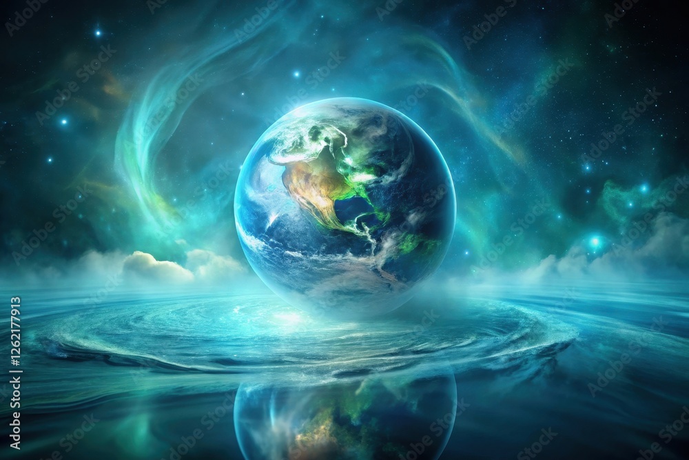 Canvas Prints a celestial orb reflecting in a tranquil cosmic ocean, surrounded by ethereal nebulae and distant st