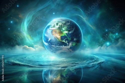 The watermark will not be included on Canvas Print.: A celestial orb reflecting in a tranquil cosmic ocean, surrounded by ethereal nebulae and distant st