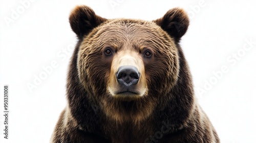 The watermark will not be included on Canvas Print.: A close up, realistic of a grizzly bear with a commanding gaze, positioned on a vivid white backgrou