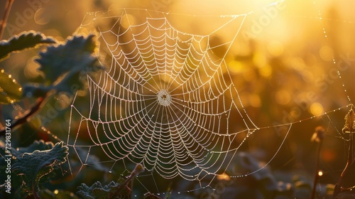 Canvas Prints a close up of a spider web on a plant with the sun shining through the spider's web on the center of