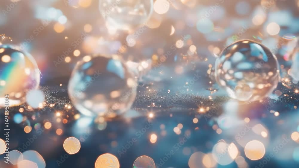 The watermark will not be included on Canvas Print.: A close-up of colorful water droplets and sparkles reflecting light with soft rainbow effects on a s