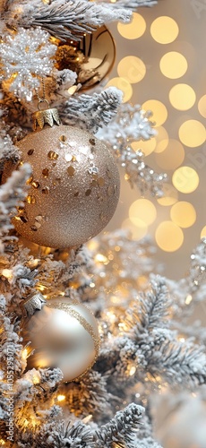 The watermark will not be included on Canvas Print.: A close-up of the christmas tree with lights and ornaments against a blurred background of sparkling