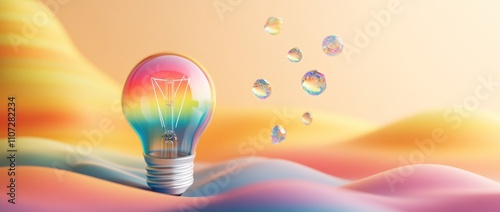 Canvas Print : A colorful light bulb amidst soft, wavy pastel backgrounds and floating bubbles -