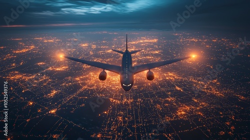 Canvas Print : A commercial airplane flies over a city whose layout is illuminated with intricate light patterns, r