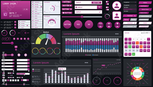 The watermark will not be included on Canvas Print.: A dark set of interface elements for web and mobile applications with modern icons, buttons, and gra