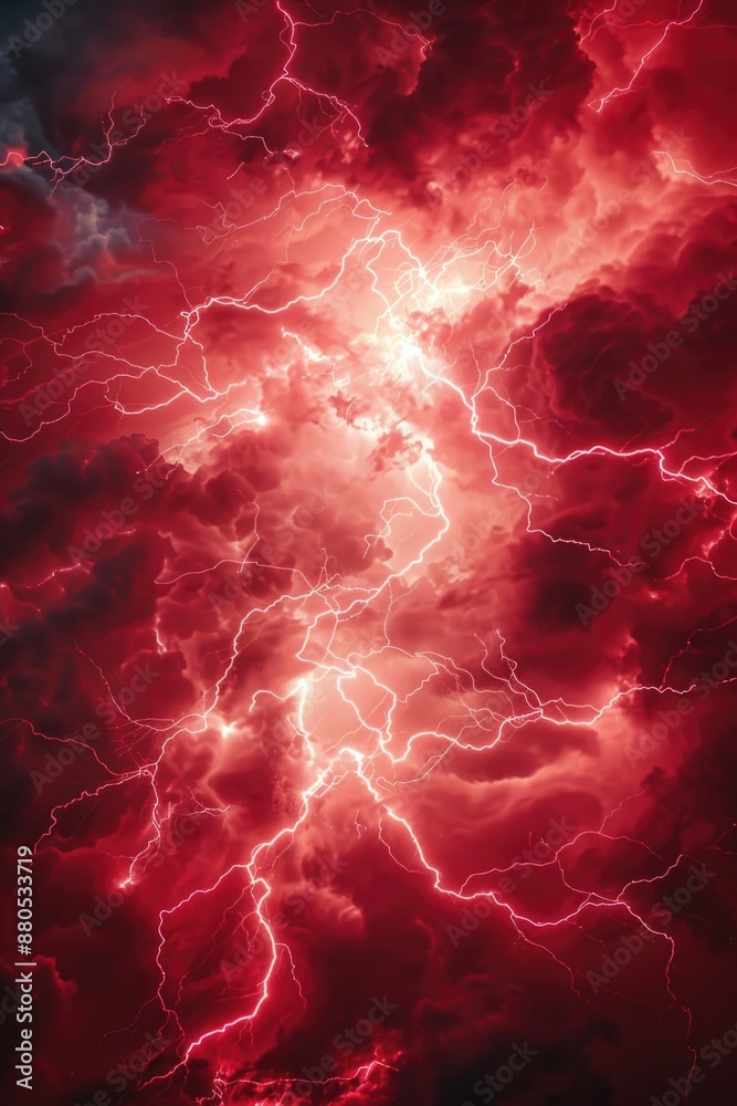 The watermark will not be included on Canvas Print.: A dramatic view of a red sky with lightning illuminating the dark clouds, perfect for use in weather