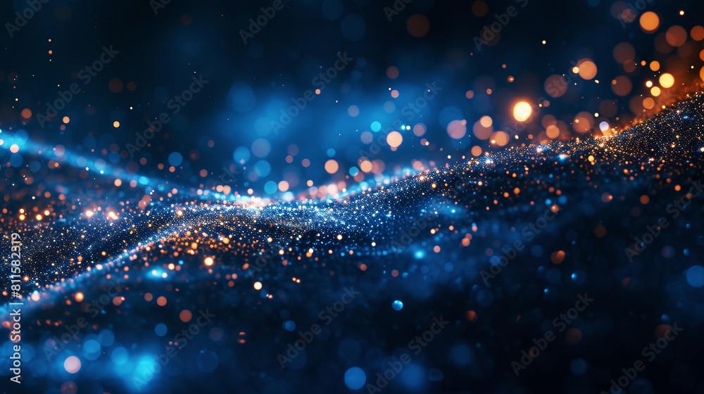The watermark will not be included on Canvas Print.: A dynamic wave of blue and orange particles, digital bokeh style, on a dark background, concept of f