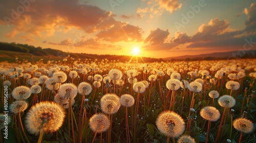 Canvas Prints a field of dandelions is in full bloom, with the sun setting in the background - Canvas Prints Canvas Prints a field of dandelions is in full bloom, with the sun setting in the background - Canvas Prints
