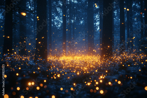 The watermark will not be included on Canvas Print.: A firefly swarm illuminating a summer forest at dusk - concept of bioluminescence and nocturnal encha