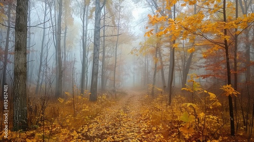 Canvas Prints a forest with trees covered in yellow leaves. the leaves are falling and the sky is cloudy