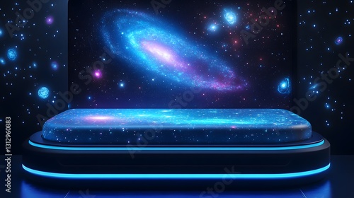 The watermark will not be included on Canvas Print.: A futuristic holographic bed with projected visuals of galaxies and cosmic elements on an isolate ba