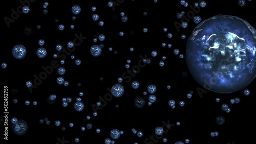 The watermark will not be included on Canvas Print.: A futuristic kaleidoscope of iridescent balls of various shapes in a free random flight in outer spa
