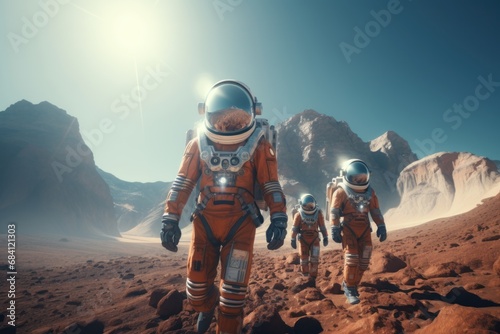 The watermark will not be included on Canvas Print.: A group of astronauts in spacesuits walk on the surface of the planet - space explorers, galaxies -