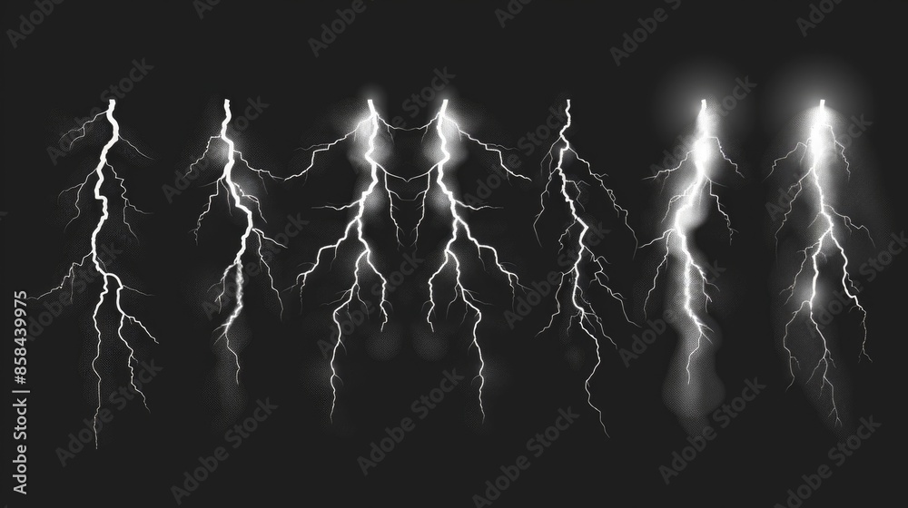 The watermark will not be included on Canvas Print.: A group of lightning flashes illuminated on a dark, black background