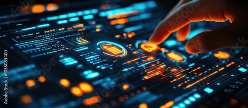 The watermark will not be included on Canvas Print.: A hand interacts with a futuristic interface with glowing blue and orange buttons -