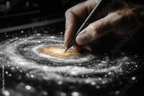 The watermark will not be included on Canvas Print.: A hand sketching the outline of the universe, symbolizing the design of life and existence - concept