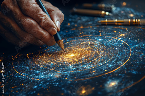 The watermark will not be included on Canvas Print.: A hand sketching the outline of the universe, symbolizing the design of life and existence - concept