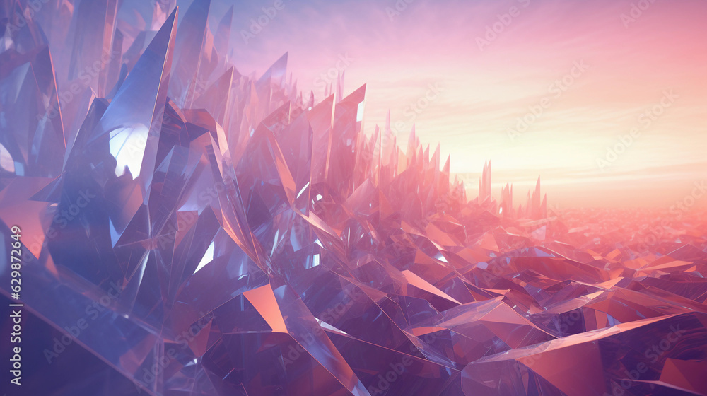 The watermark will not be included on Canvas Print.: A landscape of angular, crystalline structures, glowing under a synthetic aurora, creating a surreal