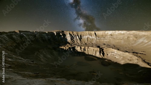 The watermark will not be included on Canvas Print.: A large crater is in the middle of a desert - the sky is dark and the stars are visible