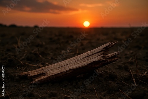 The watermark will not be included on Canvas Print.: A lone log stands silent as the sun sets over an endless field