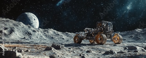 The watermark will not be included on Canvas Print.: A lunar rover exploring the surface of the moon -