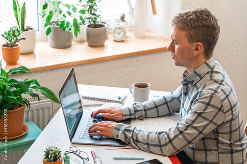 The watermark will not be included on Canvas Print.: A man in a shirt sits in a modern office and uses a laptop to work in business or programming, appli