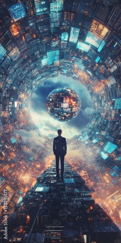 The watermark will not be included on Canvas Print.: A man stands in a tunnel with a city in the background