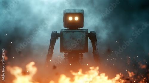 Canvas Prints a massive futuristic robot standing in the middle of a battlefield, surrounded by smoke and destruct