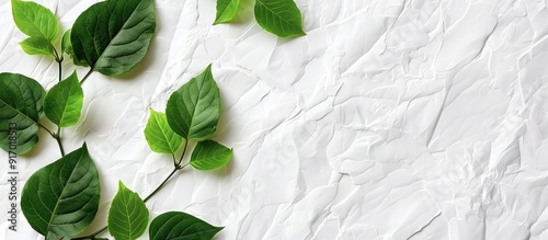The watermark will not be included on Canvas Print.: A minimal style copy space image featuring fresh green leaves on a white paper surface