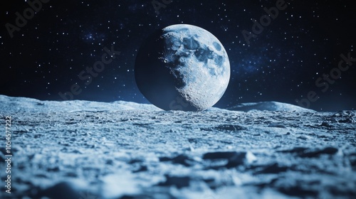 The watermark will not be included on Canvas Print.: A minimalistic representation of the moon hovering above a lunar landscape with a starry background