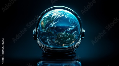 The watermark will not be included on Canvas Print.: A minimalistic view of earth reflected in a futuristic astronaut helmet against a dark background