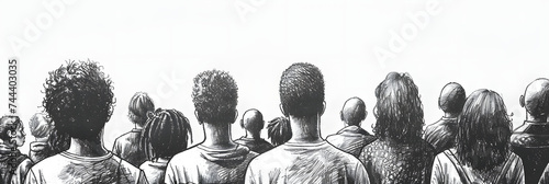 The watermark will not be included on Canvas Print.: A monochrome illustration depicting a diverse group of individuals from behind, in a crowded setting