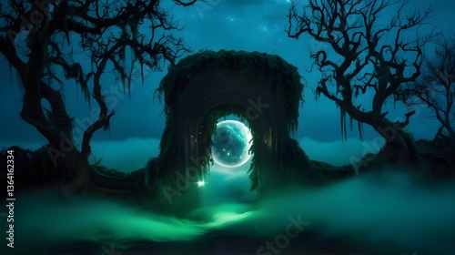 The watermark will not be included on Canvas Print.: A mystical portal glows vibrantly within a dark and haunting forest, surrounded by gnarled trees and